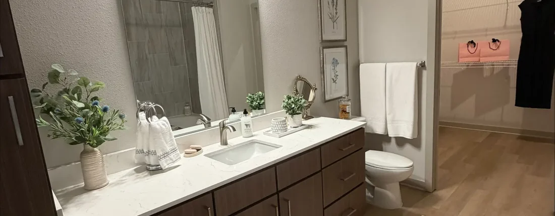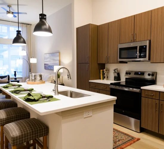 The community features a mix of studio, one-bedroom, and two-bedroom apartment homes across 13 thoughtfully designed floor plans in a luxury setting. The building and residences showcase contemporary living elements including smart thermostats, high-speed internet, security-dedicated Wi-Fi, stainless steel appliances, granite or quartz countertops, and full-size in-unit washers and dryers.